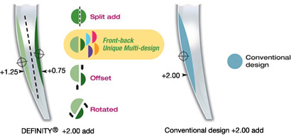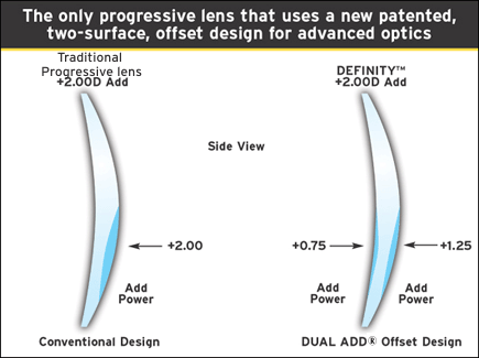 With progressive lenses, peripheral distortion increases with add power. However, patients experience substantially less peripheral distortion with DEFINITY� Lenses compared to Conventional Progressive lenses.